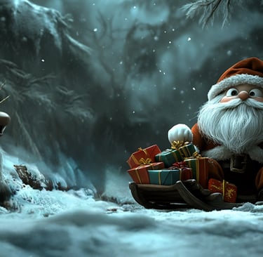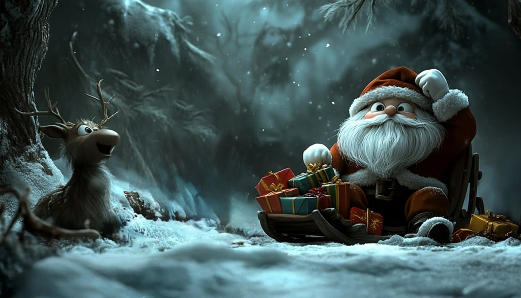 Das Glöckchen klingelte wieder, diesmal wie eine Antwort. Im selben Moment prickelte die Luft, und von oben wehte ein Wirbel glitzernden Schnees herab. Die Rentiere tauchten aus dem Mondlicht auf, landeten weich, schüttelten den Frost aus den Fellen und schnaubten zufrieden. Einer stupste den Weihnachtsmann an, als wollte er sagen: Jetzt aber.