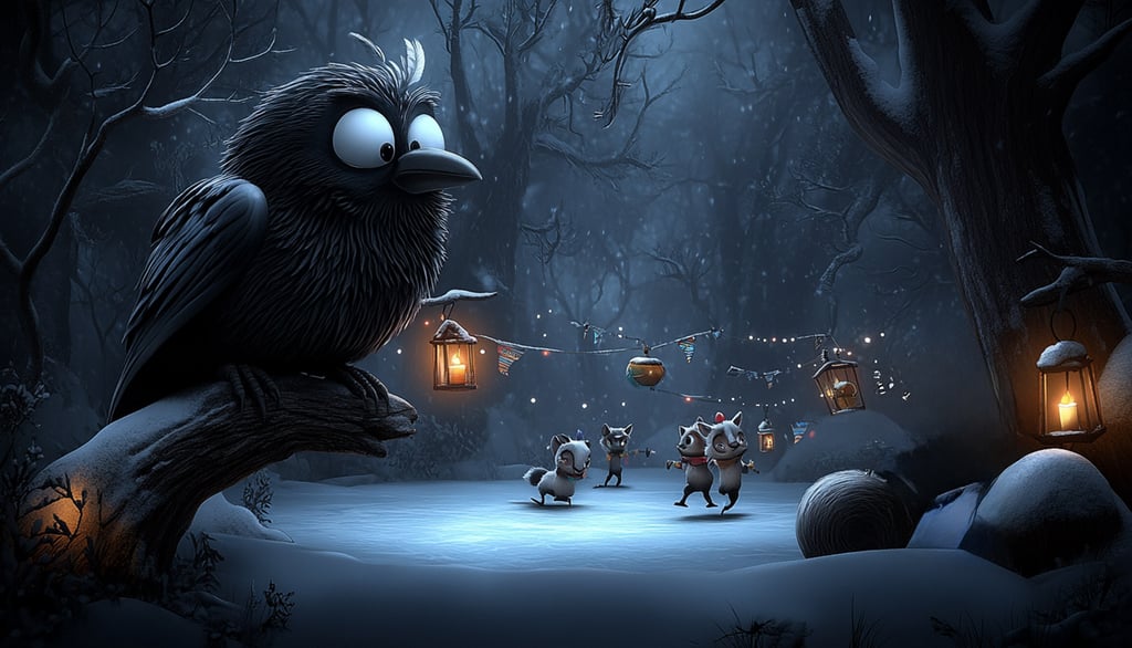 Der Schnee lag dick auf den Wiesen. Jeder Schritt knirschte leise, und die Äste der alten Eiche glitzerten im Mondlicht. Ich flatterte neugierig zum großen Platz und staunte. Meine Freunde hatten den Park in ein kleines Winterwunderland verwandelt.