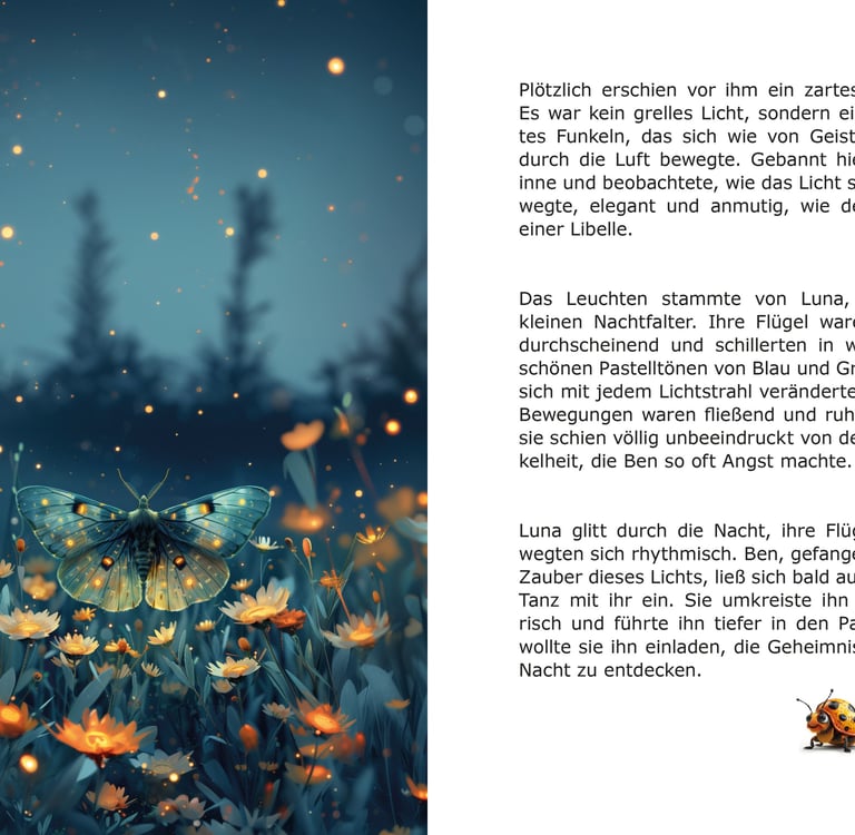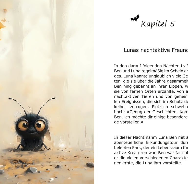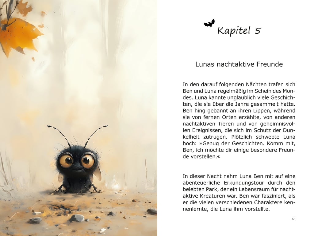 Ben, die kleine Fledermaus, lebt in einem bunten Park, umgeben von alten Bäumen und einem funkelnden Teich. Trotz seiner Angst vor der Dunkelheit sammelt er eines Abends all seinen Mut und wagt sich in die Nacht hinaus. Dabei entdeckt er eine Welt voller Magie und Abenteuer, die nicht nur seine Ängste vertreibt, sondern seine Sicht auf die Welt verändert.