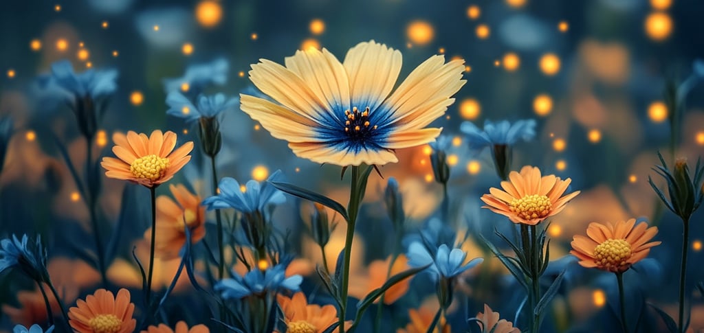 Neugierig folgten wir dem geheimnisvollen Geräusch und landeten auf der weichen Moosdecke der Lichtung. Vor uns standen die Nachtblumen, ihre zarten Blüten geöffnet zum Mond. Sie leuchteten schwach in einem bläulichen Schimmer – doch das war nicht das Erstaunliche. Sie flüsterten.